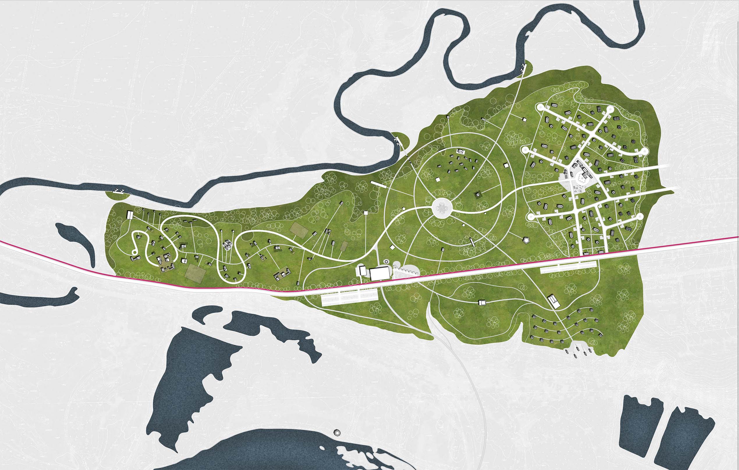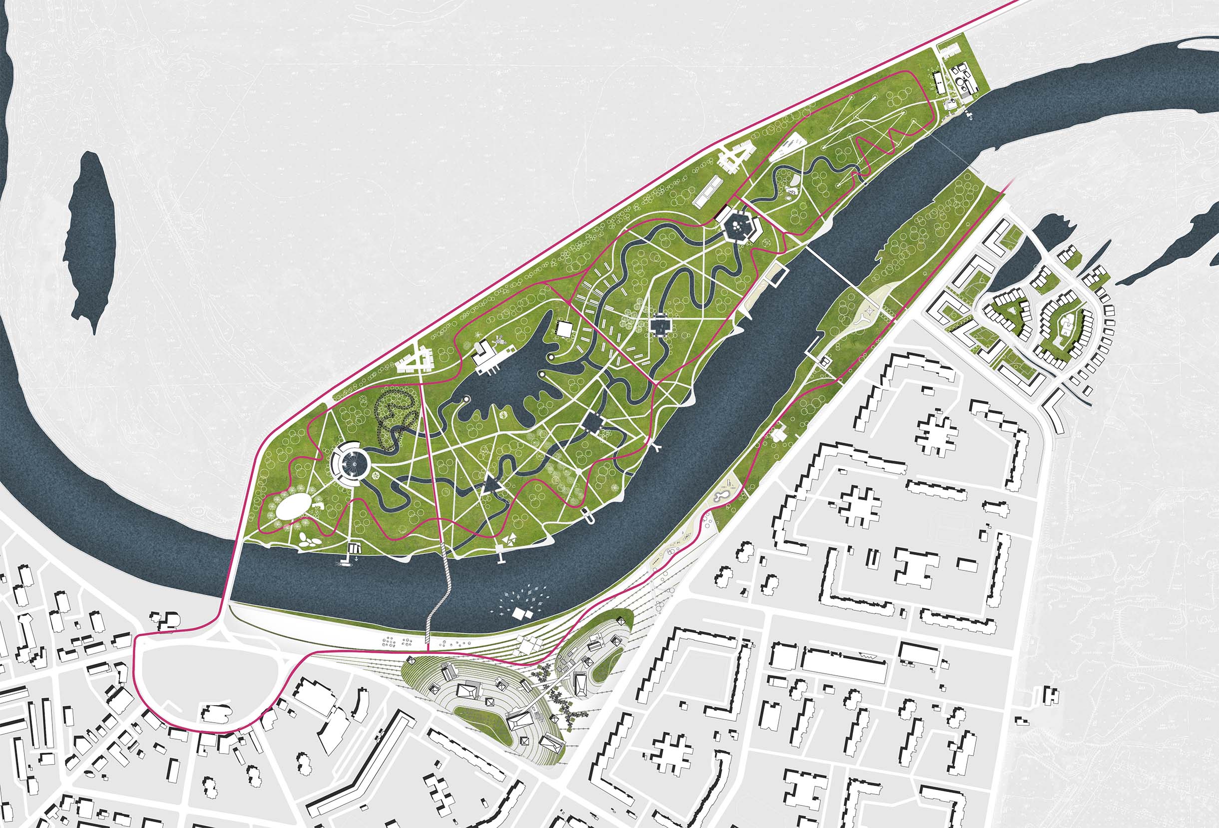 - to develop the River Cheptsa embankment, make the river an integral part of the city fabric, and create both water and land routes following the course of the river;