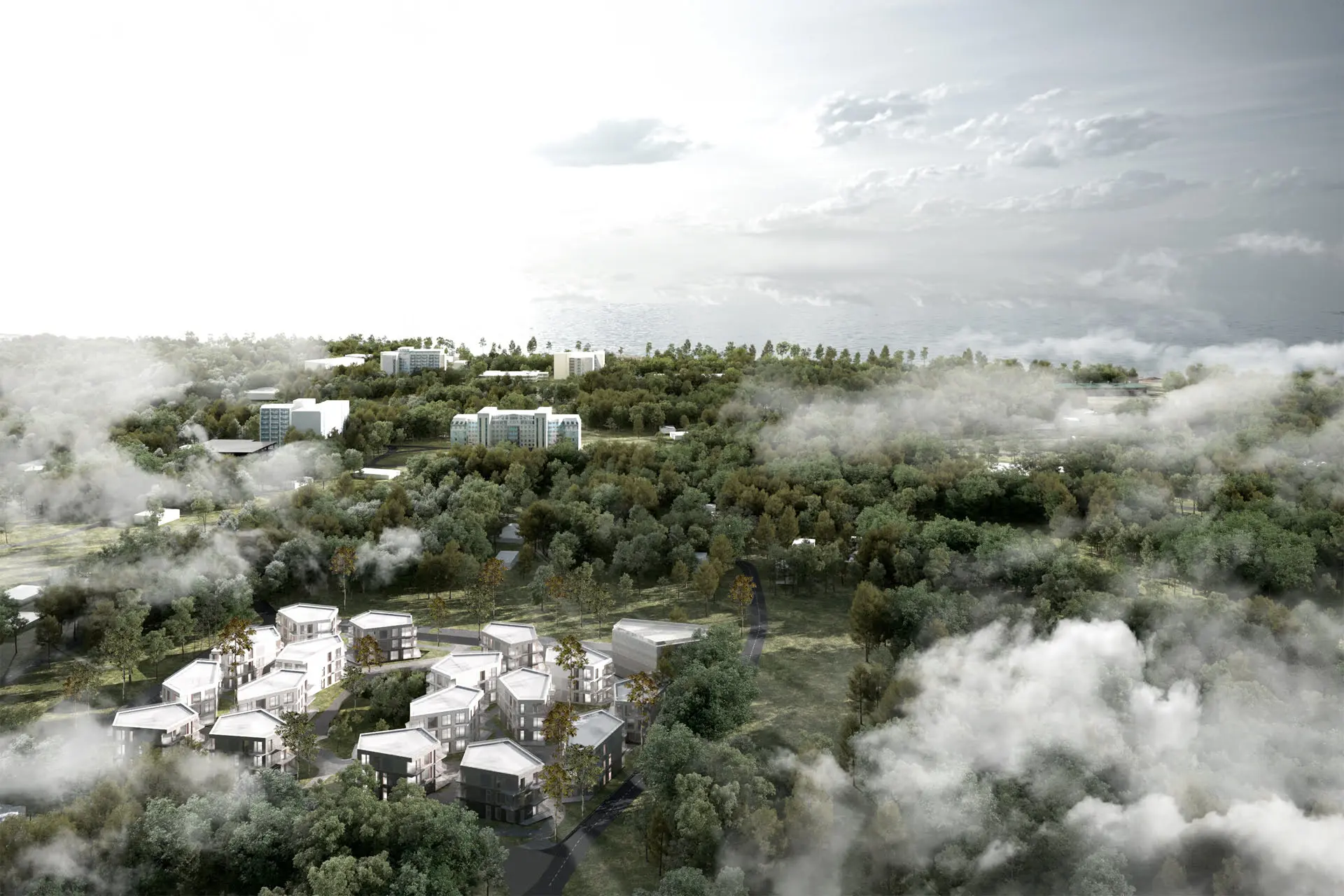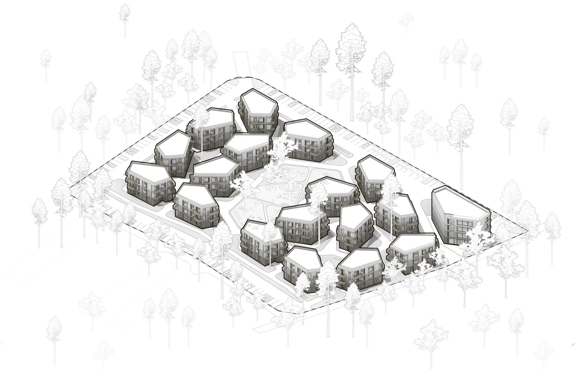 Территория проектирования расположена в Зеленогорске и представляет собой участок площадью почти 2 Га. Участок расположен в зоне регулирования застройки и, конечно, имеет ряд ограничений. Одним из основных ограничений является регулирование максимальной площади пятна застройки одного здания. В связи с этим ограничением на участке было размещено 17 трехэтажных жилых блоков и один четырехэтажный коммерческий. По периметру участка расположены парковочные места, а в центре – большой двор с детскими площадками, зонами для отдыха и прогулок. Благодаря тому, что блоки домов собраны в сложную композицию, на участке образуется множество живописных и сложных прогулочных маршрутов, подобных коротким, но ёмким интерлюдиям между значимыми объемами зданий.