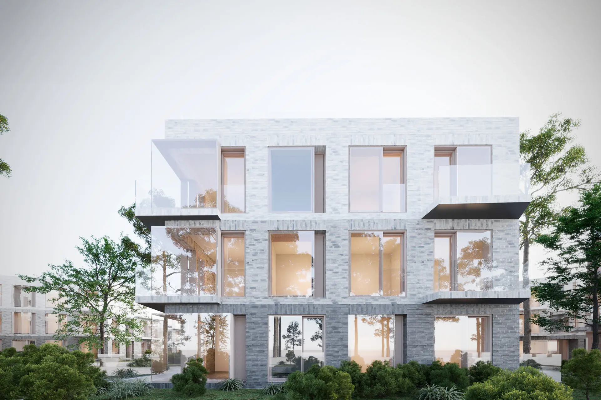 The plasticity of the facades is played with transom bricks with a gradient of shade from dark below to almost snow-white above. The gradient is a reference to working with stone. The light facades clearly illustrate their resistance to the contrasting shade of the dark emerald forest, and the large windows of the apartments set an elegiac tone for the project and transmit the warmth of the Human hearth to the surroundings.